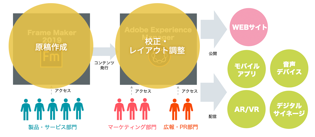FrameMakerからXMLファイルをエクスポートするところまでをFrameMakerを活用している製品・サービス部門の担当者が行ない、さまざまなチャネルに公開する業務に関してはマーケティングや広報・PR部門が担当する、というふうに作業を明確に分けることができれば、導入後に想定される業務上の混乱も最小限に留めることができると考えられます。