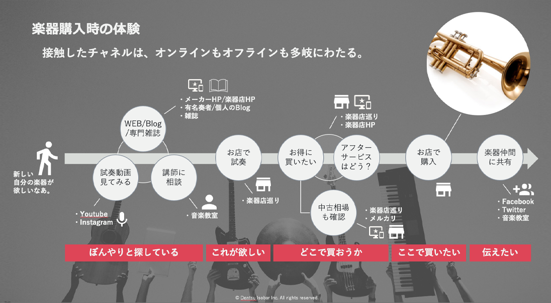少し前にはなりますが、趣味である楽器を購入した時のこと。自身が体験したジャーニーを絵に起こすと下記のようになりました。購入をぼんやりと考えている時期から、候補を絞って具体的に検討していく過程において、オンライン/オフラインを問わず、実に様々な顧客タッチポイントに接していることがわかります。