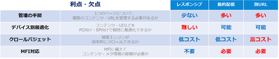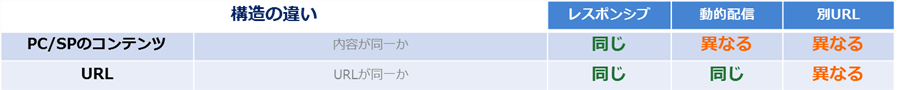 スマートフォンサイトを構成する方法には、大別して「レスポンシブ」「動的配信」「別URL」の3種があります。
