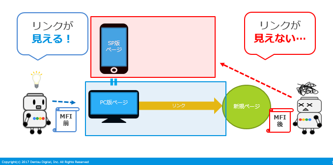 MFI導入後は「スマートフォン版ページ」を優先して見るため、「PC版には存在するが、スマートフォン版には存在しない」リンクを利用した発見・評価ができなくなります※5。