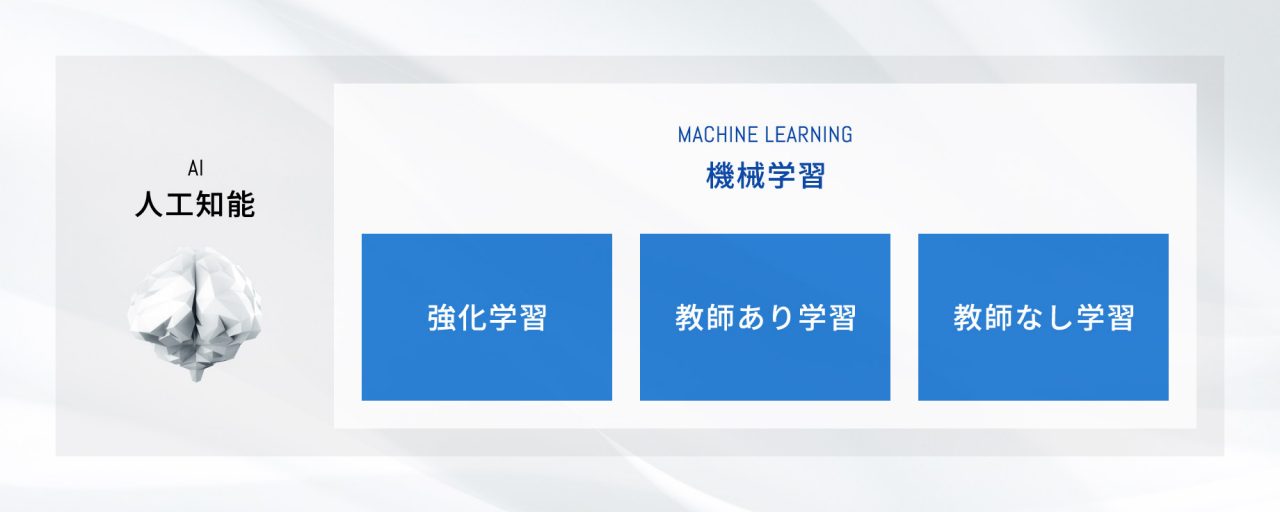 AI技術は、具体的には機械学習という技術から成り立っています。さらにその機械学習は主に三つの方法に分けることができ、教師あり学習、教師なし学習、強化学習がその構成要素となります。
