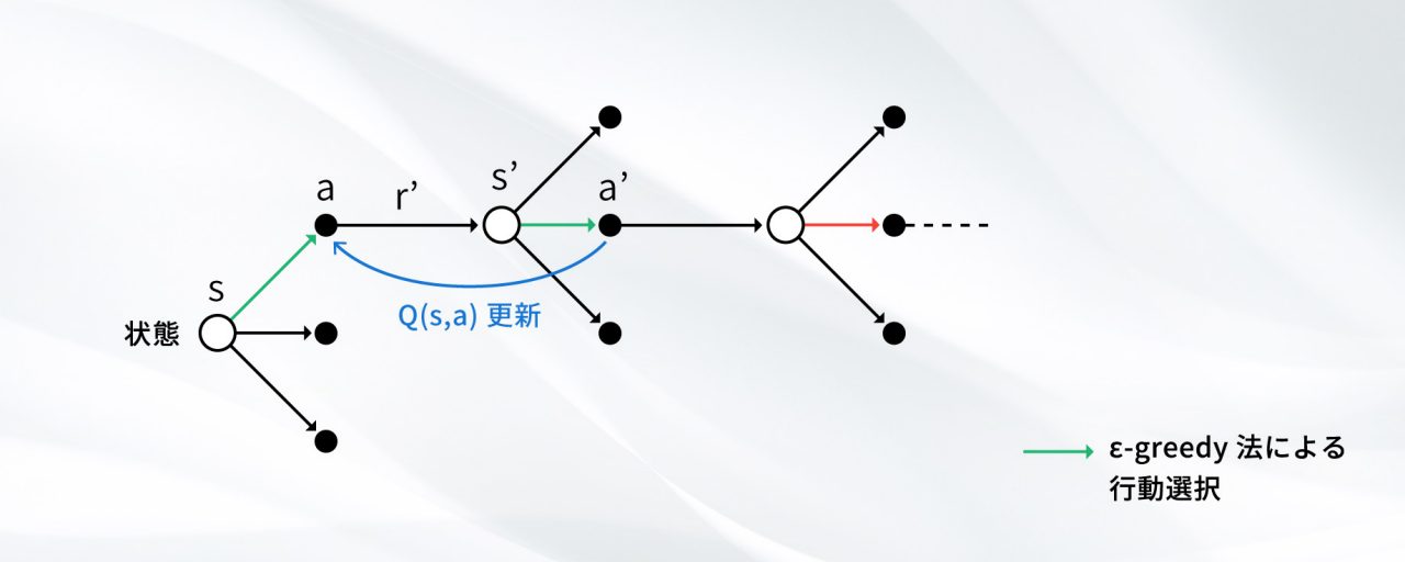 SARSAは、方策オン型のT D制御を特徴とするアルゴリズムです。SARSAは現在の状態Sとそこで実行する行動A、さらにその行動の結果得られた報酬R、行動後の状態S’が判明している場合に、現在の状態と行動についての状態行動関数であるQ関数(S,A)の更新を行います。ここでは行動後の状態S‘とS’が与えられた時の方策によって決められたエージェントの行動A’によって決まるQ関数Q(S‘、A’)が用いられます。
