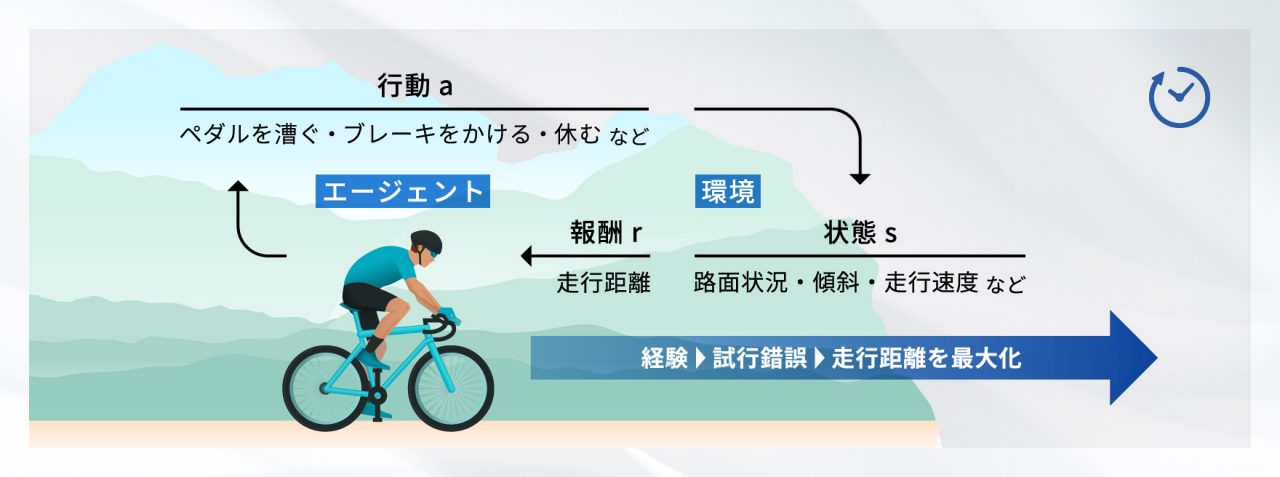 与えられた時間である一日という時間の中で、どのように行動すれば最も遠くまで自転車で移動できるかを、操縦者が走りながら獲得した経験から学習し、試行錯誤を重ねながら、走行距離を最大化することが強化学習になります。