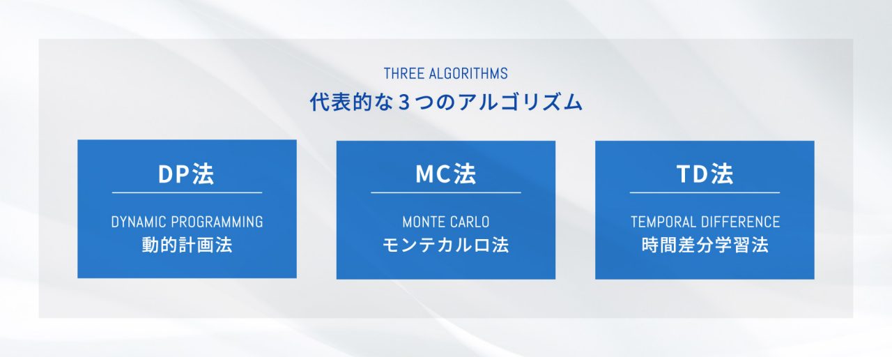 ここでは強化学習を代表的する三つのアルゴリズムである、動的計画法、モンテカルロ法、TD(Temporal Difference:時間的差分学習)法の三つを紹介していきます。