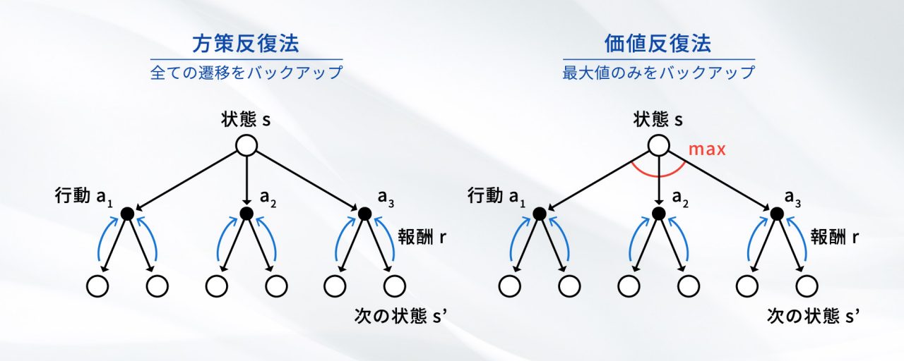 一方、価値反復法は方策反復法をより効率的にした学習方法で、最も大きな期待値が計算される行動のみを考慮して方策を更新していき、方策の改善がある一定以上の改善がなされないようになった場合に、方策評価を打ち切るという方針で学習がなされます。