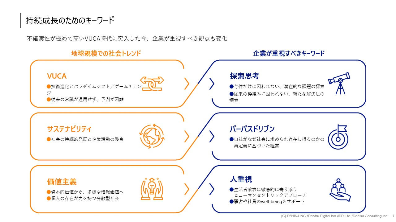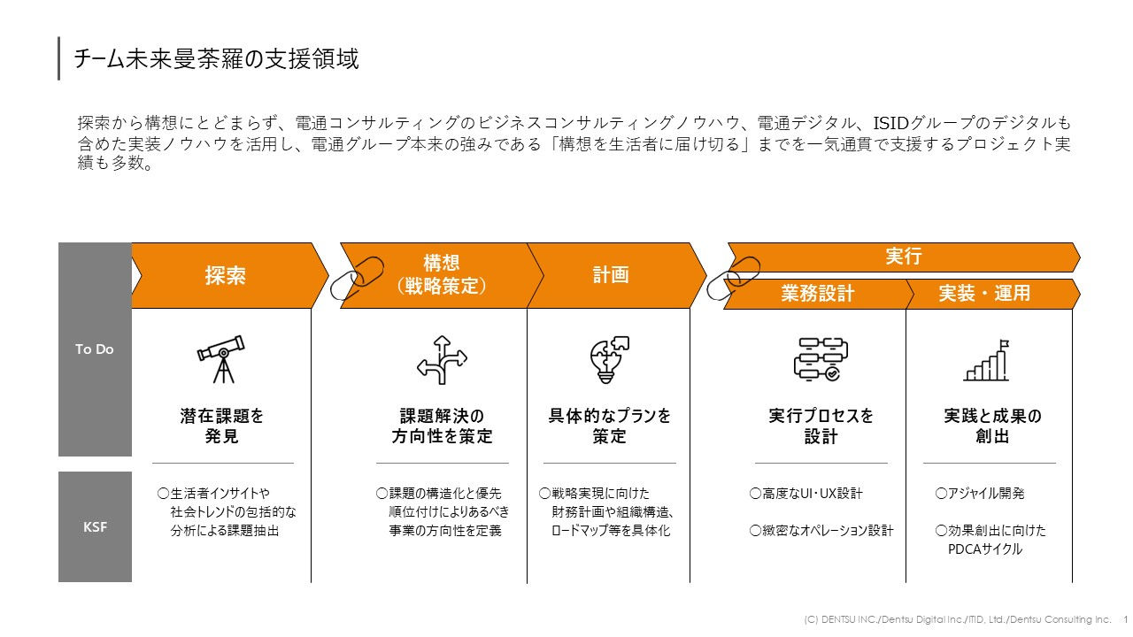 2023年より、電通デジタル、電通、電通コンサルティング、ITIDの国内電通グループ4社で横断組織を結成し、電通未来曼荼羅を活用した新規事業開発への取り組みを開始いたしました。VUCA時代に新規事業のグロースを成功させるには、探索、構想、計画、実行のシームレスな接続が重要です。