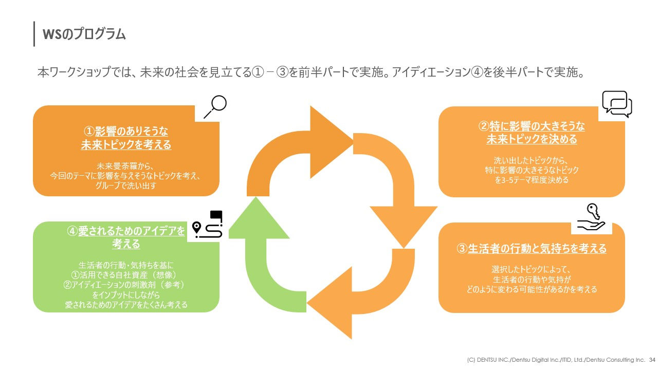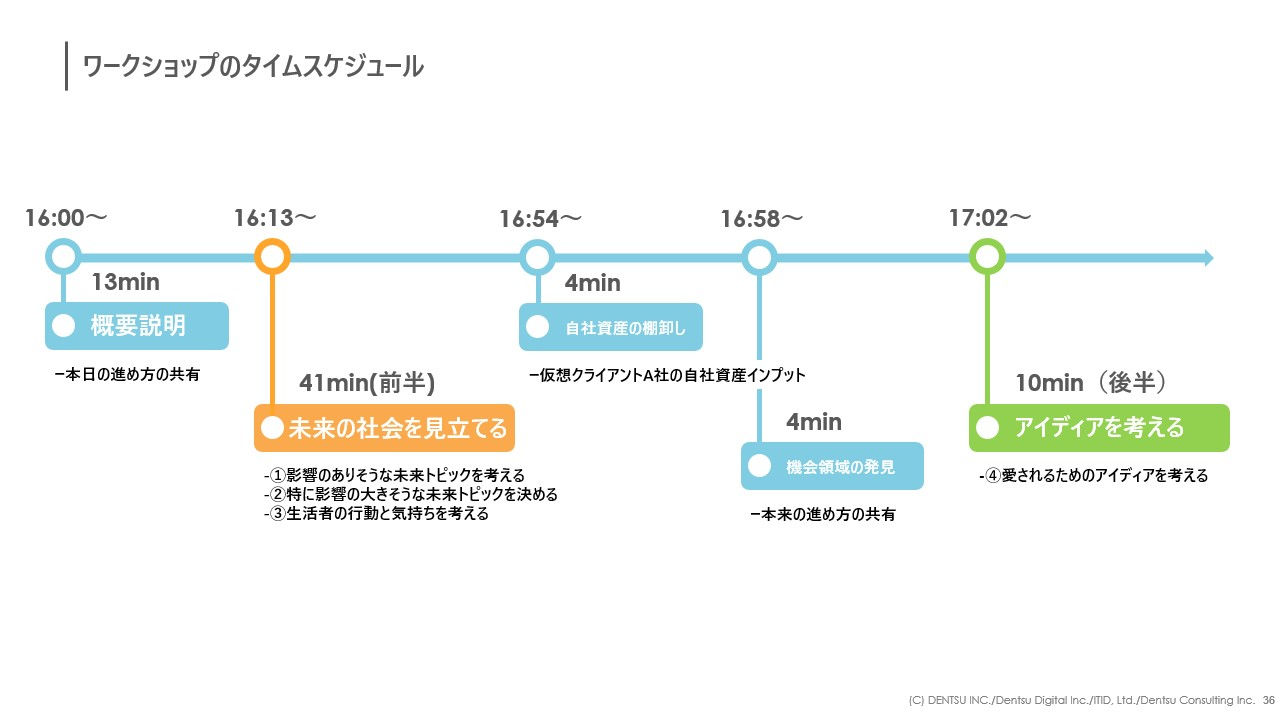 後半は10分です。生活者の行動や気持ちを基に、生活者に愛されるためのアイデアを考えていただきます。前半と後半の間に、今回のワークショップでは割愛した作業の紹介や、後半で行うアイディエーションのコツなどを少しお話しします。