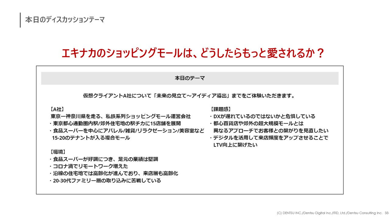 高橋:ディスカッションテーマは、「駅ナカのショッピングモールはどうしたらもっと愛されるか?」です。下記の設定を踏まえて、この仮想クライアントA社に関わる未来の見立てを行っていただきます。