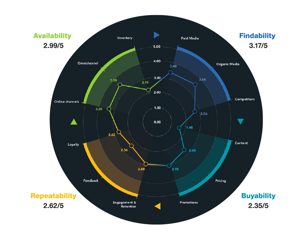 | 見つけやすさ(FINDABILITY) | 有料メディアとオーガニックメディアの最適化には大きな偏りがあるが、オンラインへの参入障壁の低下に伴う同業他社との競争の高まりに対処しようとするには、まだ改善の余地が多くあると考えられるだろう。 |