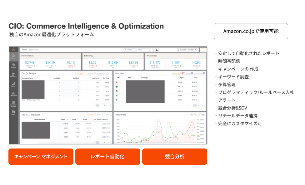 しかし、「これを人力で行なうのは現実的ではない。そこで、アイプロスペクトでは独自の管理ツールを構築した」と、Nateは「CIO(Commerce Inteligence & Optimization)」を紹介した。このソリューションは、実際にAmazon.co.jpに出店するブランドでも活用されているとのことだ。