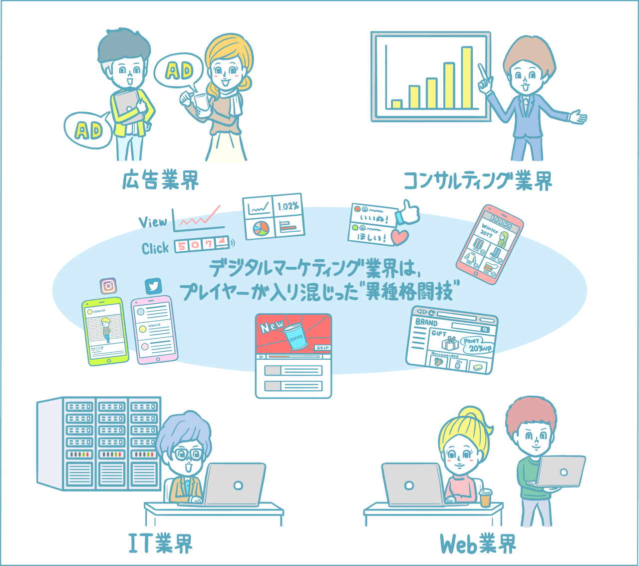 広告会社にはじまり、業務システムを扱うIT企業、ウェブ制作会社、そして就職の難関とされるコンサルティング会社まで。それぞれの業界が、それぞれの強みを軸足にして、デジタルマーケティングに関連したサービスを提供しています。