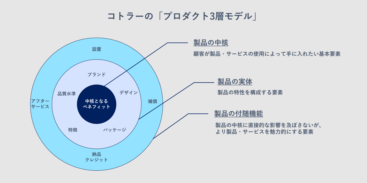 「プロダクト3層モデル」では、製品を中核・実体・付随機能の3層に分けて考察しています。