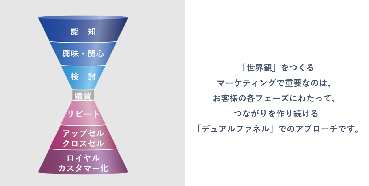 世界観を作るマーケティングで重要なことは、お客様の各フェーズにわたってつながりを作り続ける、「デュアルファネル」でのアプローチです。デュアルファネルとは、「新規顧客獲得のためのファネル」(上部)と「既存顧客のためのファネル」(下部)の2つから構成されています。