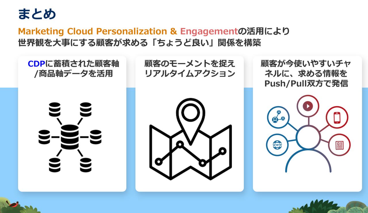 「Marketing Cloud Engagement」「Marketing Cloud Personalization」と「Treasure Data CDP」を組み合わせることで、以下のように、世界観を大事にする顧客へのアプローチで大切な3つのポイント(顧客理解、Good Surprise、ちょうどいい距離感)を押さえることができます。