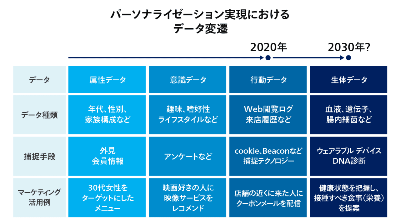 店舗の近くに来た人に、クーポンメールを1on1で送るなどといった「行動データ」によるパーソナライゼーションは、すでに実現できている。今後は、血液や遺伝子などといった「生体データ」を活用したマーケティングが、さらに進化していくことになるだろう。
