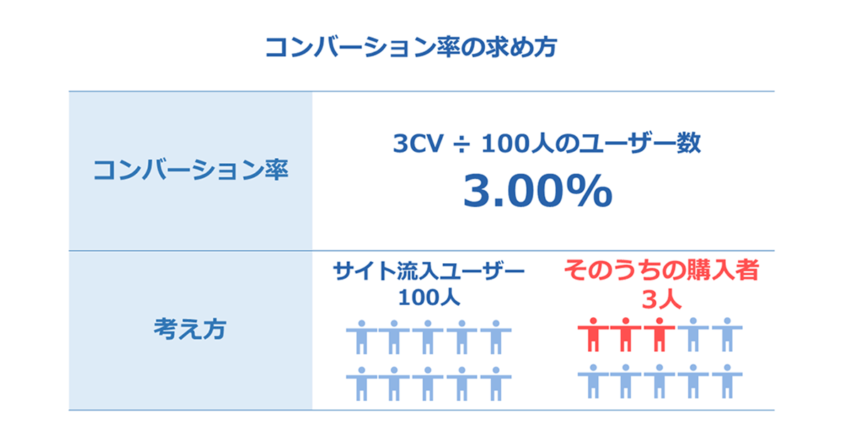 例えば、B to Bサイトで、「お問い合わせフォームからの製品問い合わせ」をCVに設定していた場合、サイト訪問者数100に対して、フォームからの問い合わせ数が3だとしたら、3÷100=0.03、すなわちそのWebサイトのCVRは3%となります。