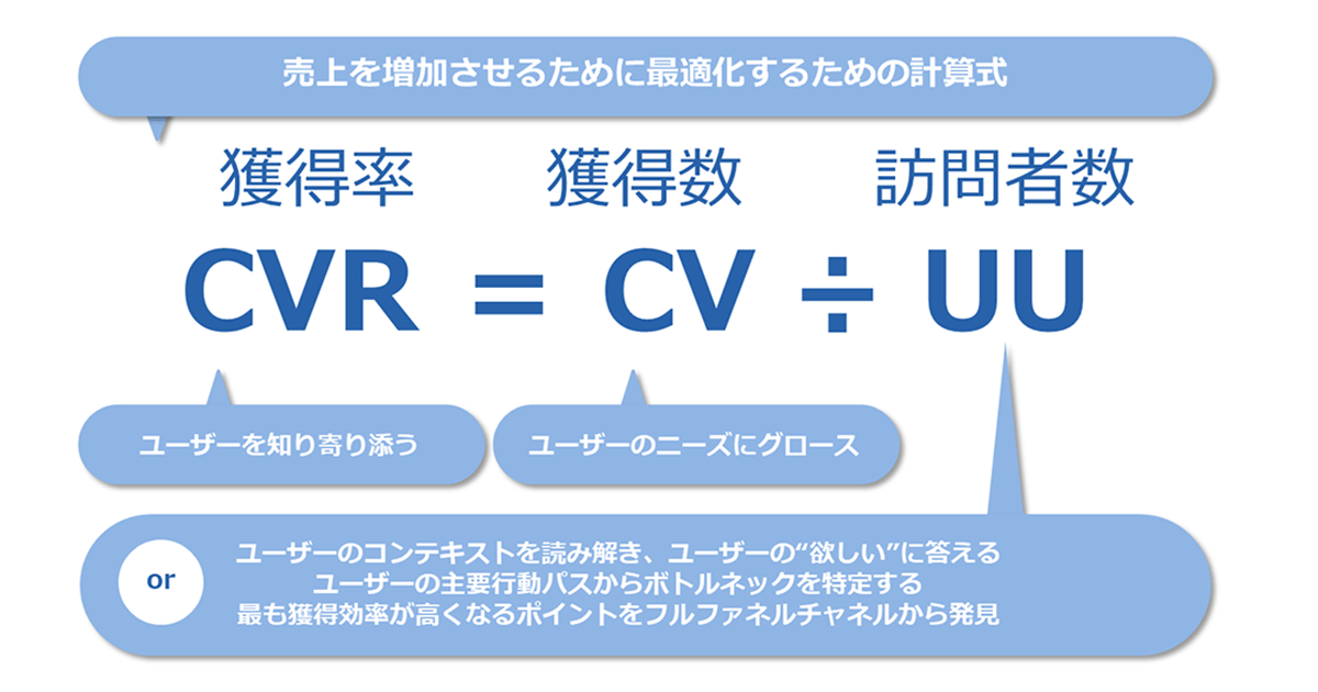 多くの場合、CV数は売り上げに直結しています。CV数を最大化する方法には、大きく分けて、2つの方向性が考えられます。