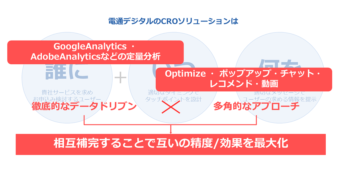 この2つを掛け合わせてCROを実施することにより、全体最適からパーソナライズによる個客獲得まで、Webサイトの課題に応じて、多角的にクライアント企業の売り上げをグロースさせることができるのです。