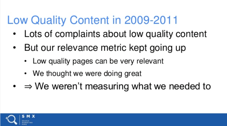 「低品質でも、関連性が強い情報であることが大事」という考えが、コンテンツファームの氾濫を招いた[1]