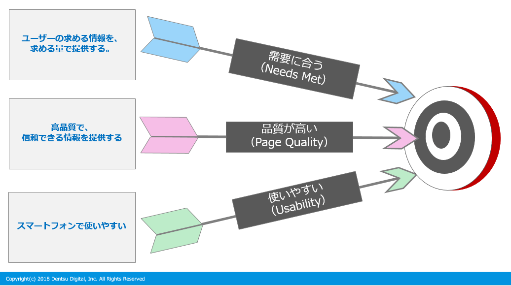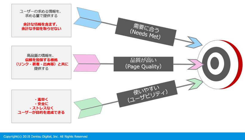 一番重要なのは、コンテンツが「ユーザーの需要に合った質・量の情報を、最低限の手間で提供できるか」という点を問う「Needs Met」です。評価を高めるには、ユーザーの役に立つ情報を、適量で届けることが必須です。