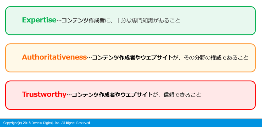 E-A-Tの内容 (出典:Google 品質評価ガイドライン(セクション3.2)、電通デジタル)