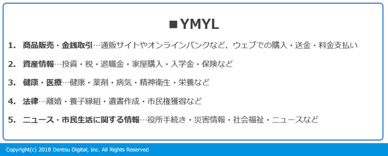 特に、ユーザーの健康・財産に深刻な影響を与える「YMYL(Your Money, Your Life)」関係のコンテンツでは、特に高いE-A-Tが求められます。2017年末に日本で実施された「医療・健康系アップデート別ウィンドウで開く」はこの評価が顕著に表れたもので、医療・健康に関するキーワードではE-A-Tが担保できているウェブサイトが評価されやすくなりました。