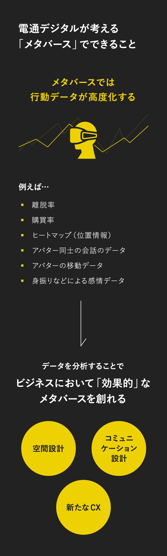 特にメタバースでは、今までウェブやアプリで取得できなかったデータがあります。それらを有効活用すれば、新たなCXの創造をメタバースで設計できる可能性がある。