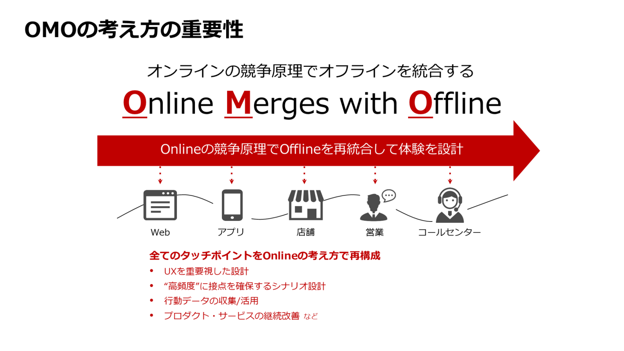 OMOは、O2O(Online to Offline)の進化概念です。Webでクーポンを配って来店してもらうのがO2Oだとすると、デジタルデータを起点にして、オンラインとオフラインを融合する施策がOMO 。オフラインでもオンライン的な戦いをしていく、そんなものの考え方です。O2Oよりもう少し顧客目線の概念かもしれません。
