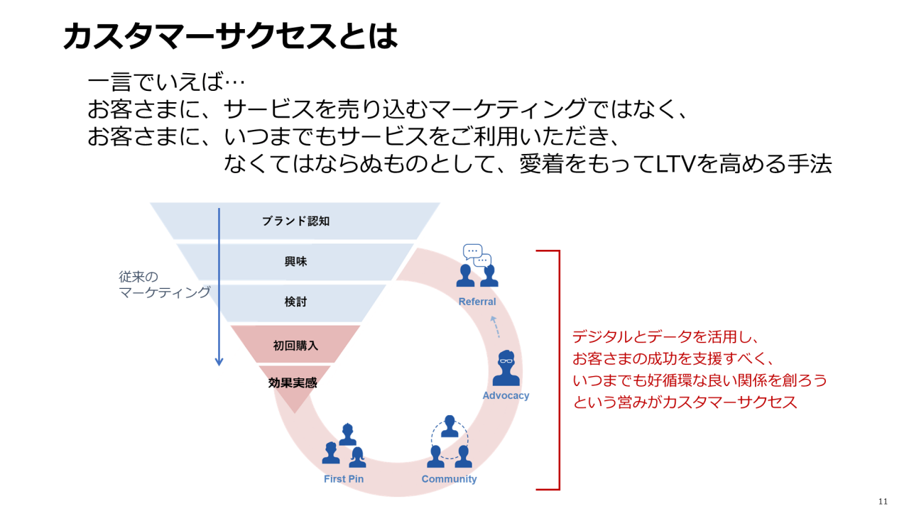 カスタマーサクセスとは、お客さまに、愛着を持って長くサービスを使っていただき、LTVを高める手法です。