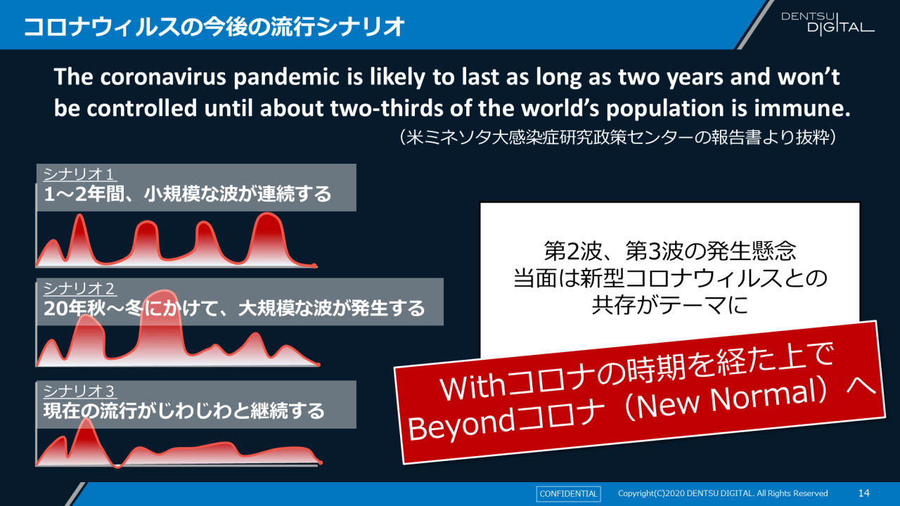 いずれにしろ2年間ほどはこの状態が継続するのではないかという観測で、やはり新型コロナウイルスとの共存は考えなければいけない。Withコロナ時代があったうえで、アフターコロナ、BEYONDコロナの世界に入っていく流れなのかなという見通しです。