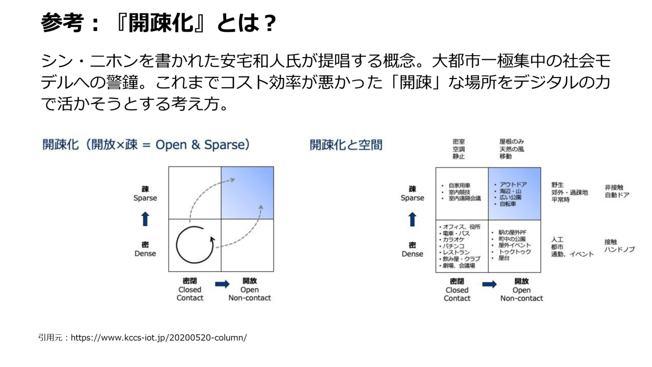 都市は「密閉(Closed)かつ密(Dense)」な空間です。人と機能を集約させていて、効率が良い代わりに、今回のコロナのようなことにはすごく弱い、