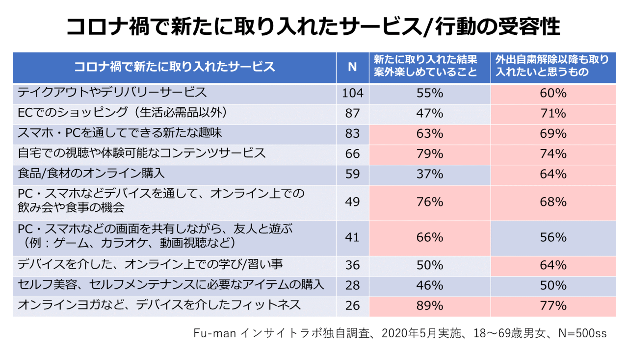 特徴的なのが、「外出自粛解除以降も取り入れたい」という意向が軒並み50%以上を示しています。仮にコロナウイルスの流行が収まったとしても、コロナ禍で経験したサービスは不可逆で、生活自体が変わってきていると言えるのではないでしょうか。