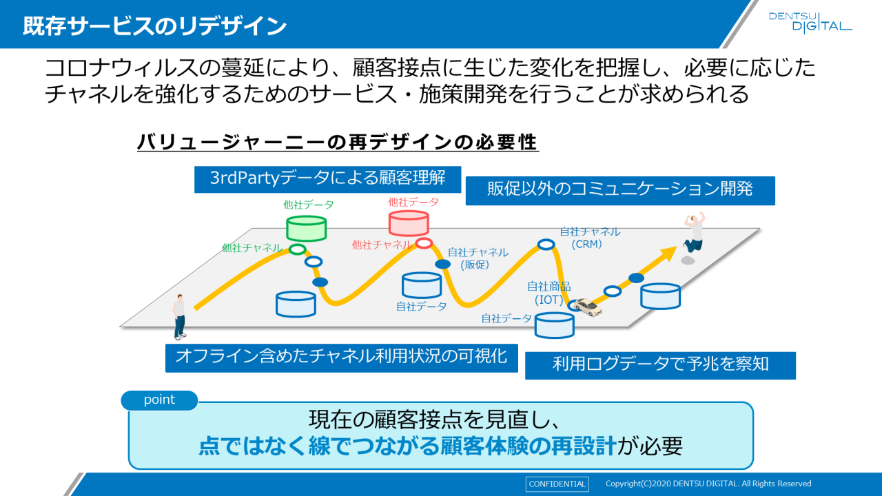 BEYONDコロナを見据えたDXで大事なのは、個客の体験を起点にして、点ではなく、線でつながるバリュージャーニーをきちんと描くということです。顧客接点に生じた変化を把握し、必要に応じたチャネルを強化するためのサービス・施策開発を行うことが求められます。