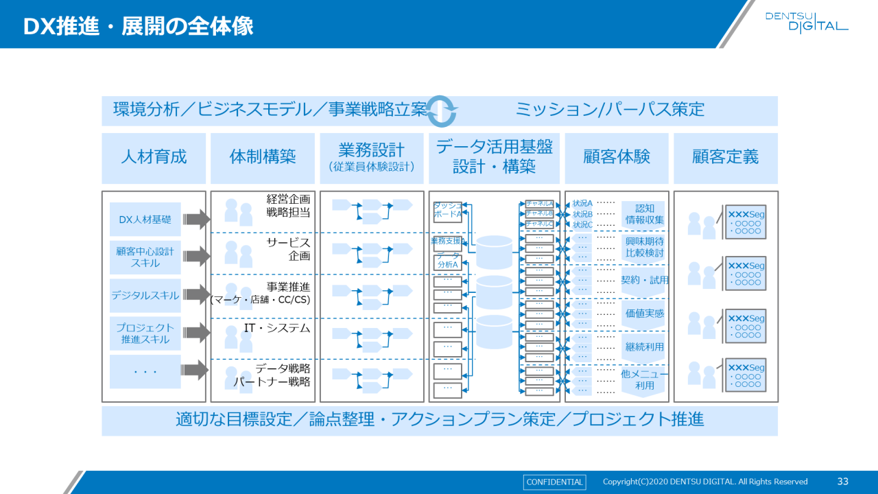 DXの課題やタスクは多岐にわたって存在します。まず環境分析、ビジネスモデル作成、事業戦略立案に加えて、ミッションやパーパスの定義が必要です。そのうえでお客さまの体験を描き、その体験を実現するための基盤を作る。その基盤を使うための業務設計や業務を回すための体制、さらには人材育成も視野に入れて、アジャイルに進めていく。かなりハードルの高い取り組みだということは間違いありません。