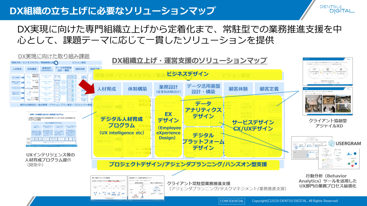 われわれ電通デジタルCXトランスフォーメーション部門は、ビジネスデザイン、デジタル人材育成プログラム、EXデザイン、データアナリティクスデザイン、デジタルプラットフォームデザイン、サービスデザイン、CX/UXデザインなど、DXに必要なあらゆるソリューションをご用意して、クライアント企業に寄り添いながらご支援したいと考えています。