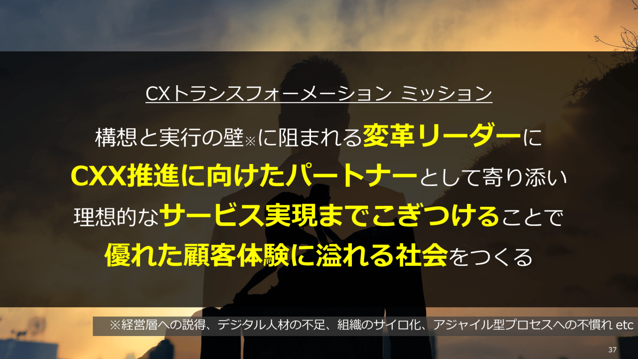 このCXトランスフォーメーションは変革リーダーの方に寄り添いたいと思って作ったサービスでもあります。構想と実行 の壁に阻まれるリーダーの皆さまにパートナーとして寄り添い、理想的なサービス実現までこぎつけることで、優れた顧客体験に溢れる社会を作りたいと考えています。DXに関して何らか課題を抱えて悩まれているお客さまは、お気軽にご相談ください。