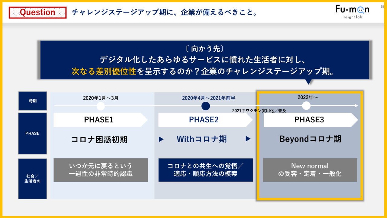 模索から新しい生活様式を受容し、定着する第3の段階。われわれが向かう先である「BEYONDコロナ期」[注1]というフェーズは、あらゆるサービス分野のデジタル化に慣れた生活者に対して、デジタルがベース与件となっていく中、企業として次なる競合優位性をどう示すか?という課題に挑むステージアップ期に突入していくと考えられます。