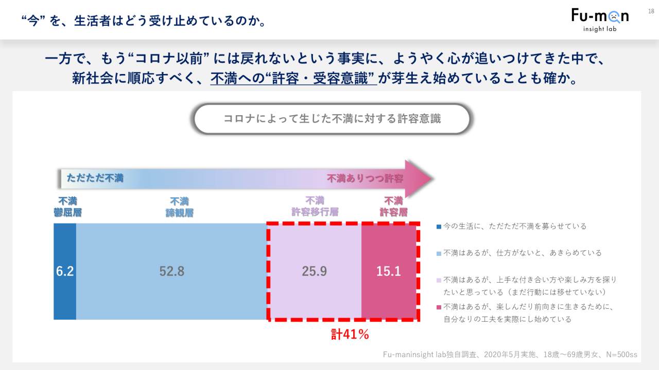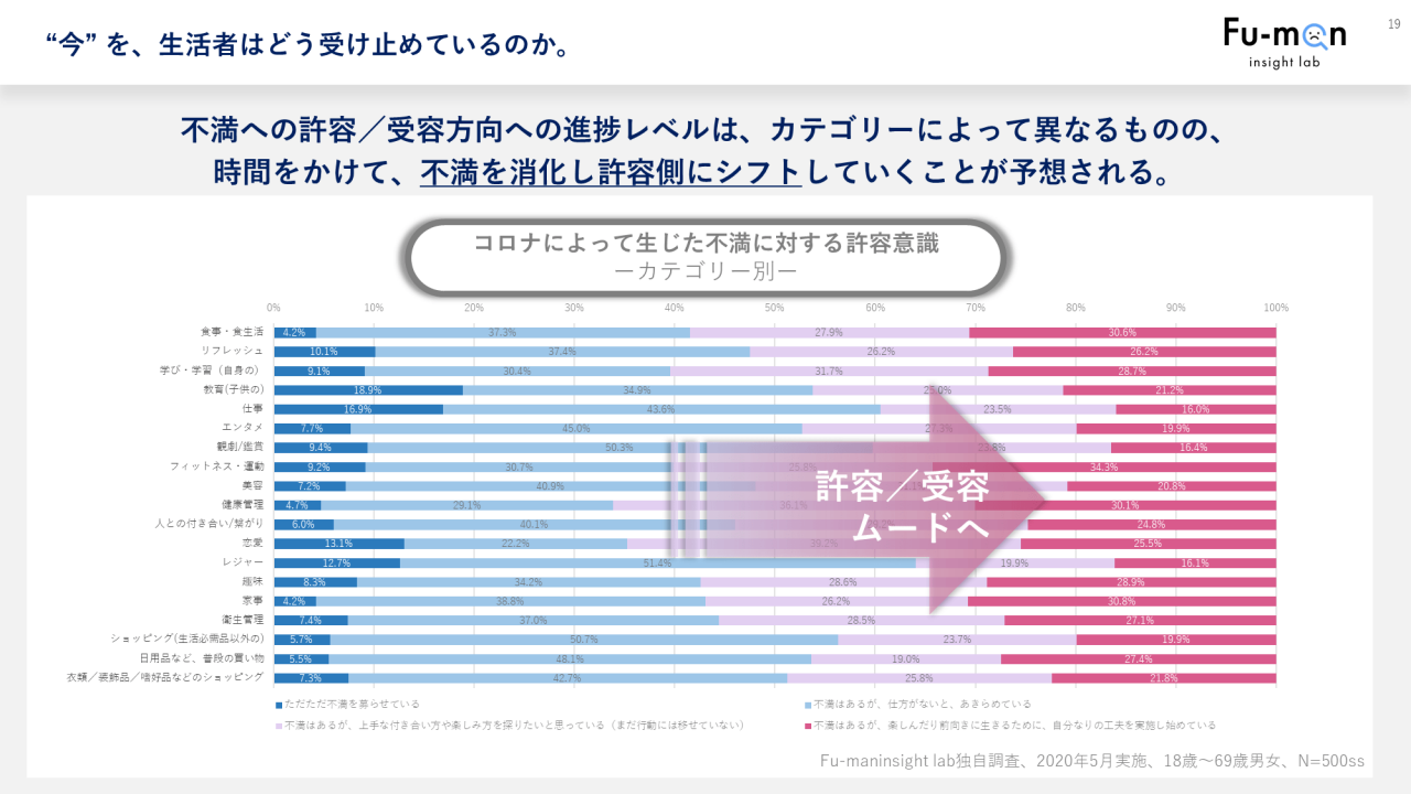 一方で、約4割が不満への許容、受容の意識を持ち始めているということもうかがえました。不満を募らせながらも、もうコロナ以前には戻れないのだという事実を受け入れ、新しい社会に順応し始めていることも確かです。