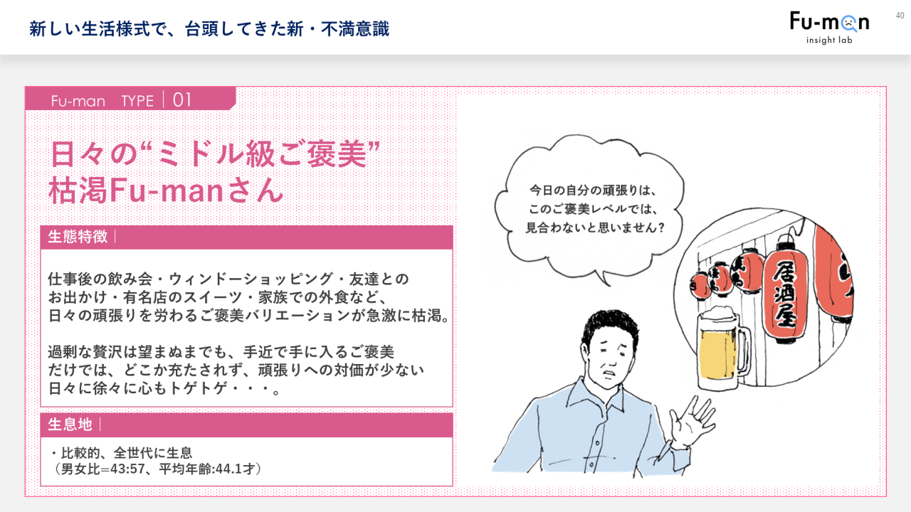 紹介した6つのタイプの中でもっともボリュームを占めているのが、タイプ1「日々の"ミドル級ご褒美"が枯渇しているFu-manさん」でした。