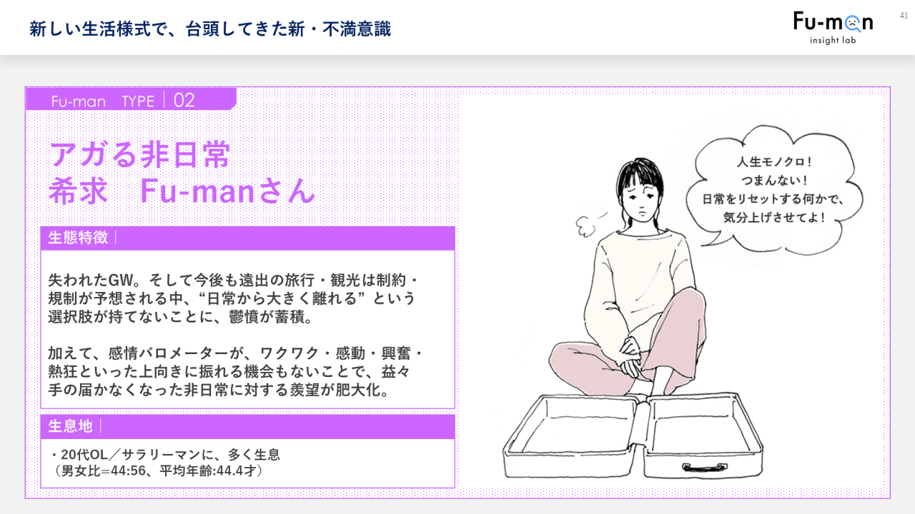 タイプ2は「アガる非日常希求Fu-manさん」です。今後も旅行や観光などが制約される見通しの中、日常から大きく離れるという選択肢が持てないことにうっぷんがたまっています。「人生モノクロだ」と、空っぽのスーツケースを前に、リセットする何かで気分を上げたいと、非日常に対する羨望が肥大化しているような状況です。20代のOLやサラリーマンに多く生息していました。