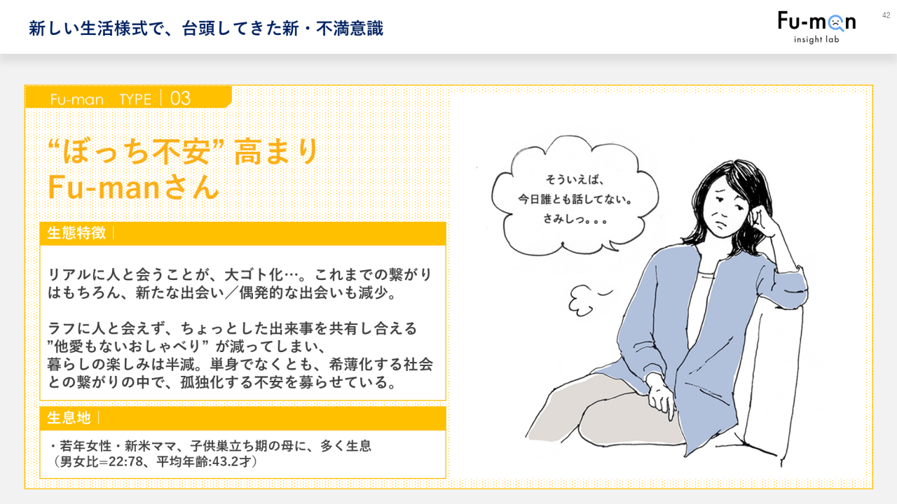 タイプ3は「ぼっち不安高まりFu-manさん」。友人と会ってたわいもないおしゃべりができない、新たな出会いも減ってしまったなど、暮らしの楽しみが半減してしまい、孤独化していく日々に不満を募らせるFu-manさんです。若年女性や新米ママ、また子どもが巣立った女性に多く生息しています。