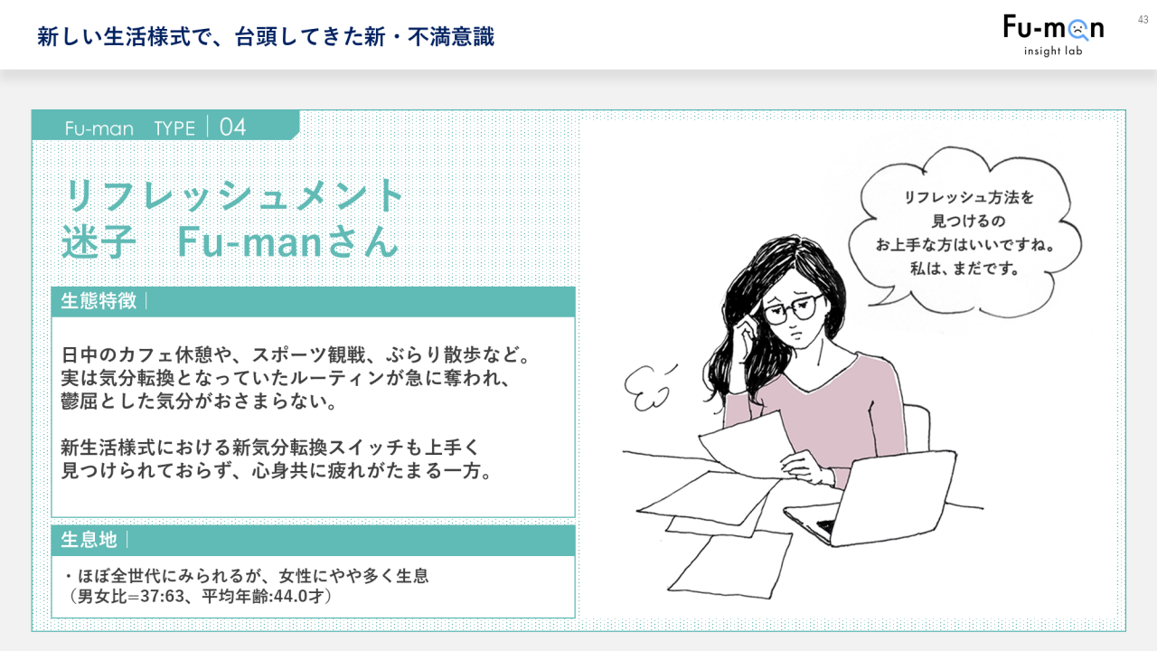 タイプ4は「リフレッシュメント迷子Fu-manさん」です。カフェでの休憩や散歩など、気分転換となっていたルーティンが奪われてしまいました。しかし、代わりになるような新しい気分転換がまだうまく見つけられていなくて、心身ともに疲れがたまっている状態です。女性に多くて、こちらもほぼ全世代に生息しています。