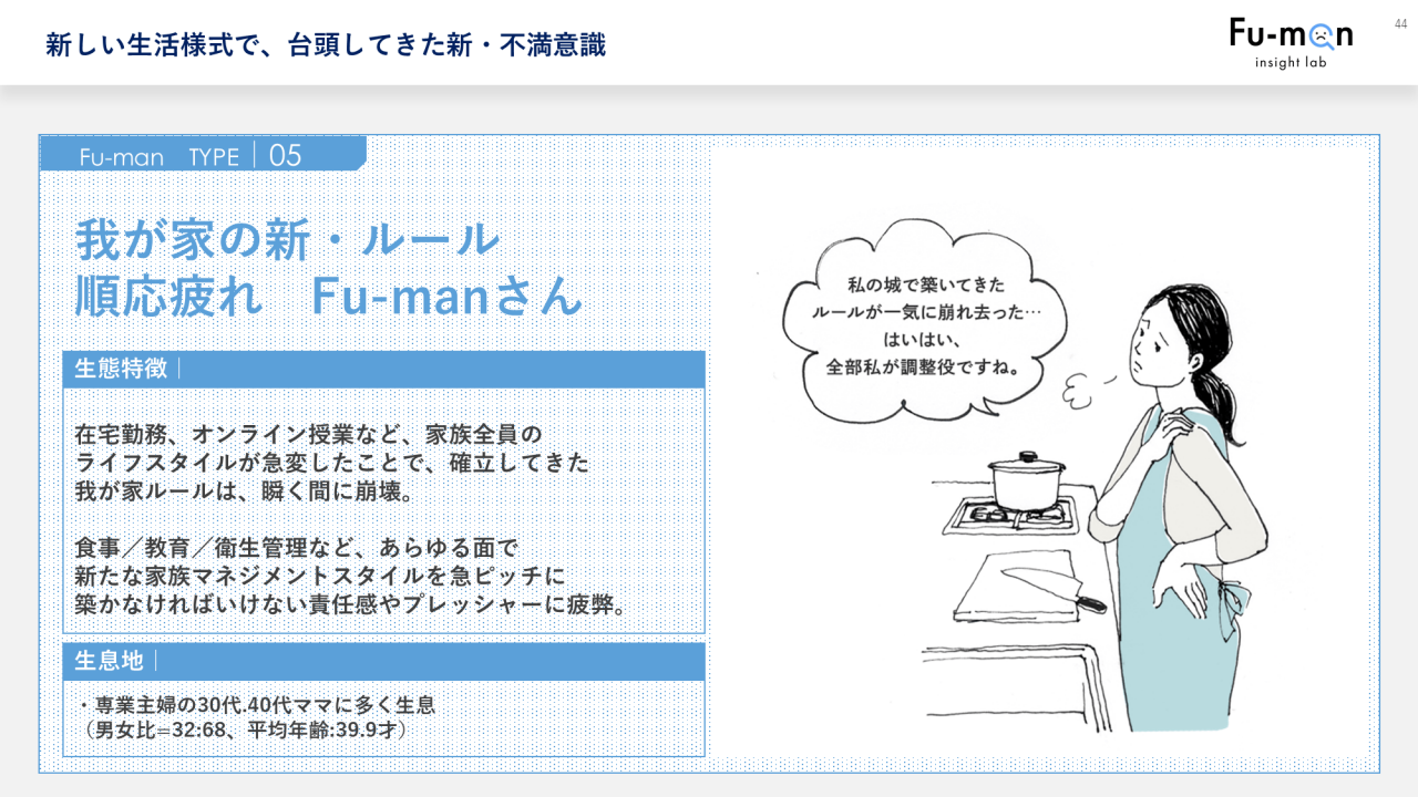 タイプ5は「わが家の新・ルール順応疲れFu-manさん」です。コロナによって家族全員のライフスタイルが急変してしまい、食事や掃除、洗濯、教育など、これまで築いてきたわが家のルールが崩壊。わが家の新しいルールを確立していくことに不満を抱え、心身の疲れを募らせています。30代、40代の専業主婦に多く生息しています。