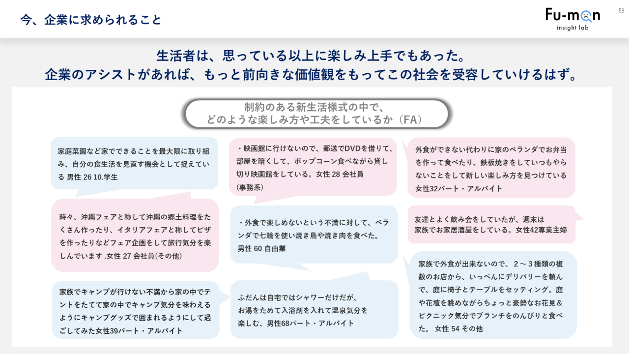 今回はFu-man insight lab™で行った「コロナが生んだ新不満を探索する定点Web調査」「顧客体験の事例研究活動から得た示唆・考察」を中心に、これからの生活者が求めること、企業に求められることは何なのかということを紹介します。