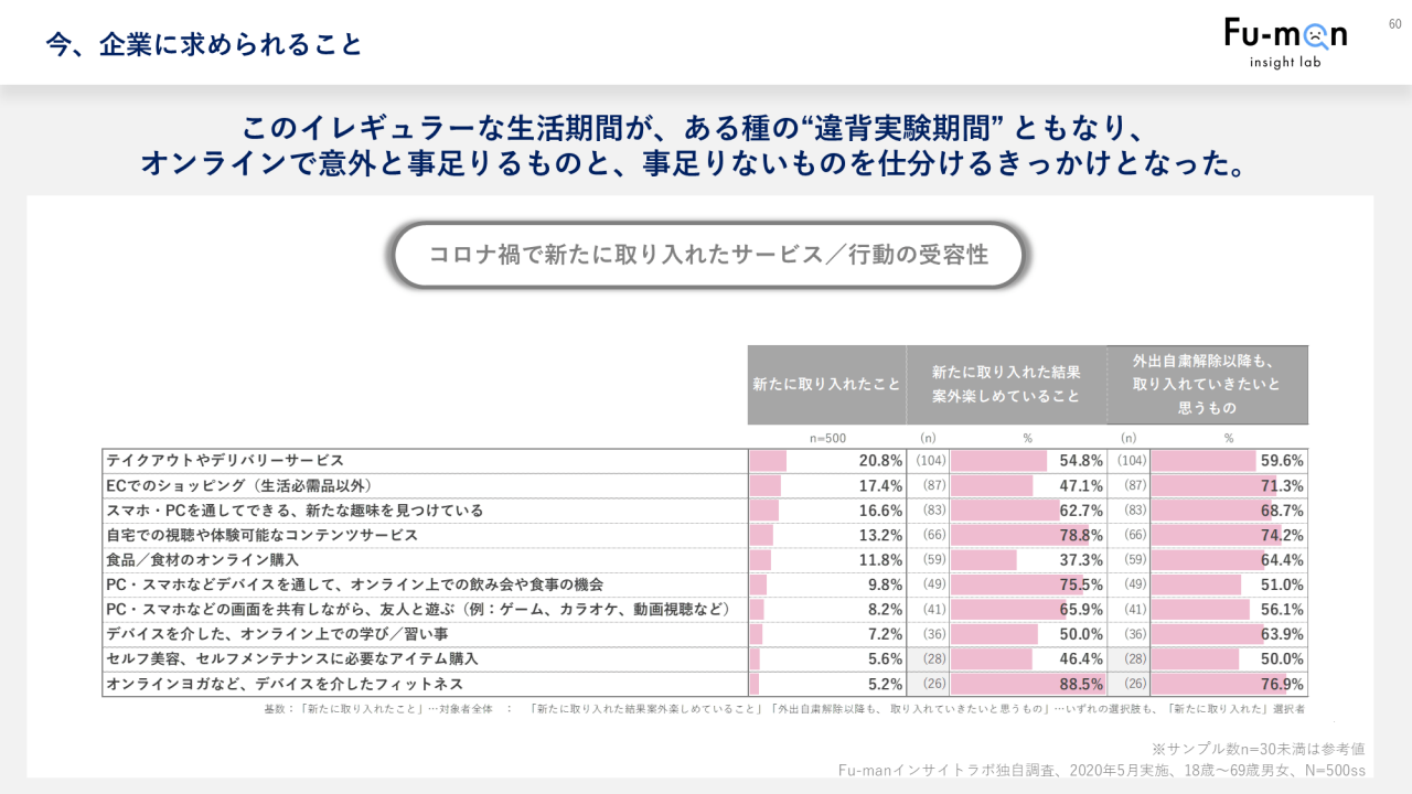 こうした企業のアシストがあって、生活者はこの有事、新しい生活様式に対する不満や不安から解放され、徐々に許容や受容しつつあるのだと思います。
