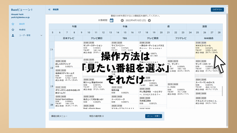 続いて谷内宏行氏が、ビデオリサーチ社の事業で電通が技術協力している「Buzzビューーン!」という新サービスを紹介しました。Buzzビューーン!は、AI全自動分析エンジンを搭載した、テレビ番組のTwitter反応を確認するサービスです。