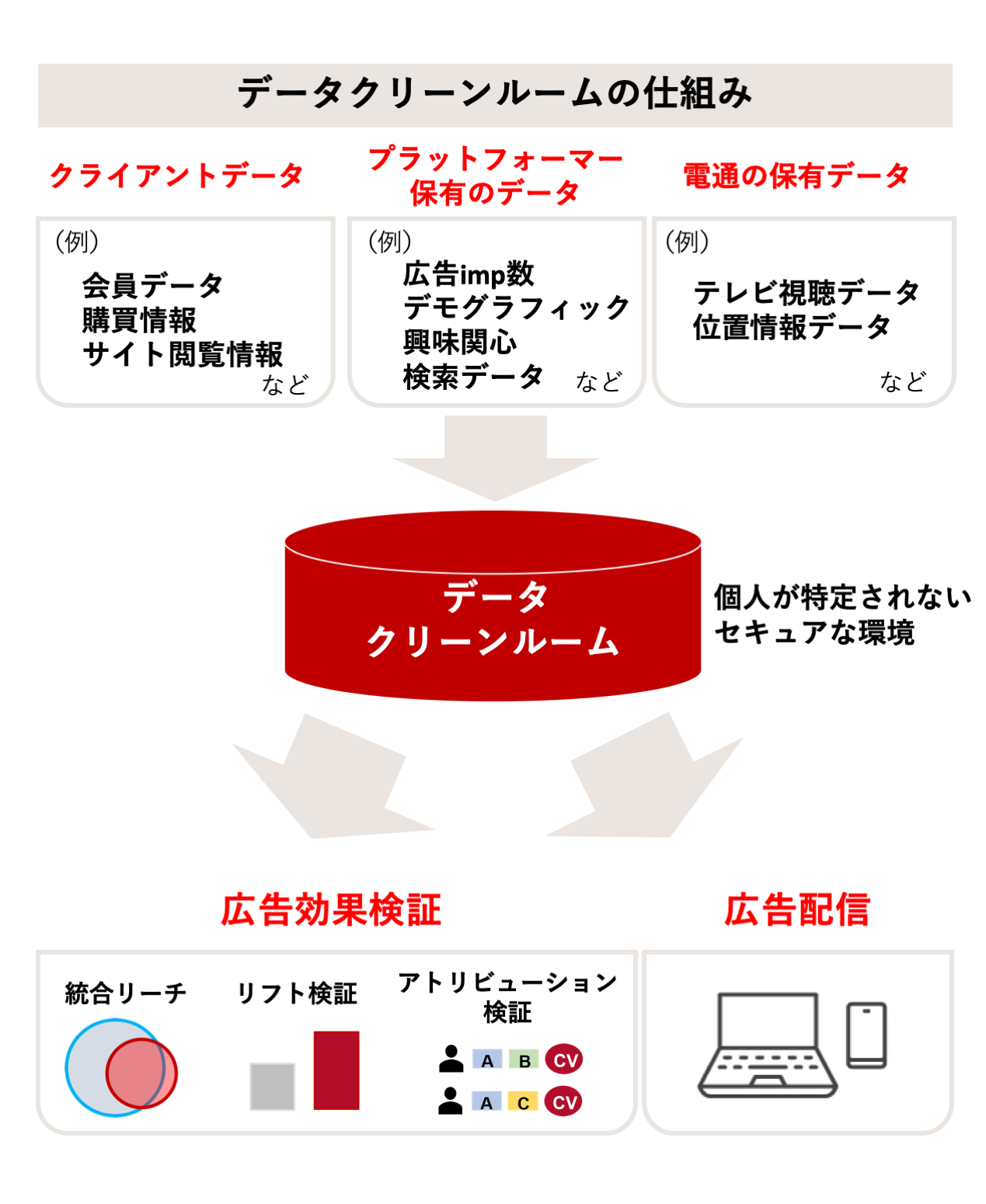たとえ自社の保有するデータが限られていたとしても、データクリーンルームを使ってプラットフォーマーが持つデータと統合・分析することで、高精度なまま詳細かつ長期間の各種行動データが手に入るというわけだ。見逃せないのは、電通が持つテレビ視聴データなども活用できる点だ。