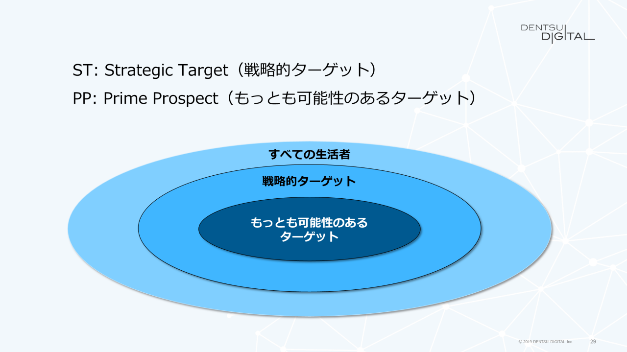 STは、ブランドがリソースを投下する最も大きなくくりです。マスマーケティングのターゲットとほぼ等しく、長期的に定義します。頻繁に変わることはありません。