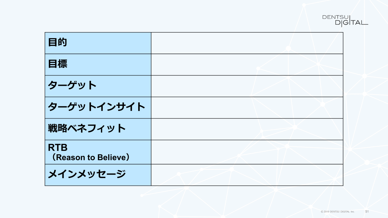 クリエイティブブリーフの項目は、「目的」「目標」「ターゲット」「ターゲットインサイト」「戦略ベネフィット」「RTB(Reason to Believe)」、そして「メインメッセージ」と進めます。