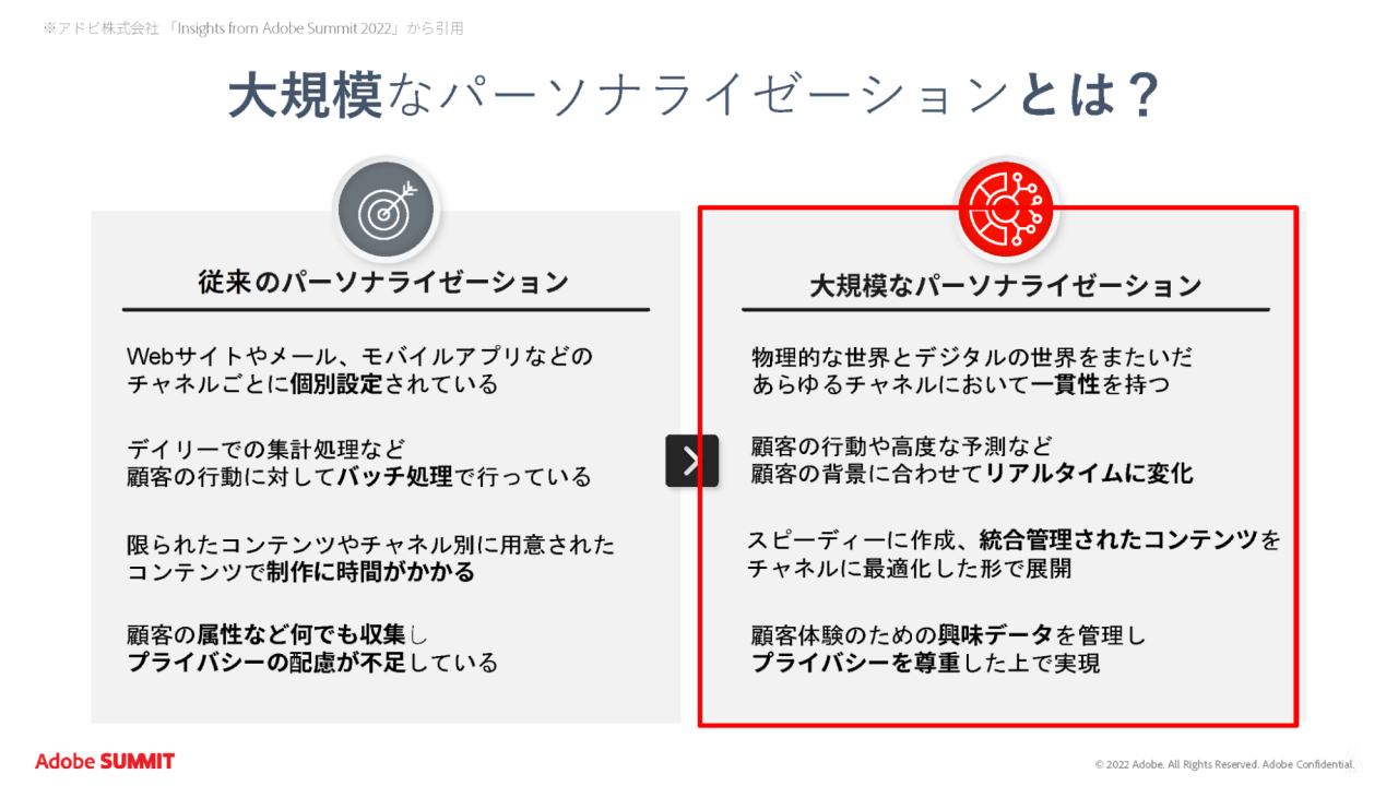 一方、大規模パーソナライゼーションは、統合管理されたシステムにより、一貫性を持つコンテンツを顧客に合わせスピーディに作成、オンライン・オフラインの各チャネルに最適化し、リアルタイムに提供します。